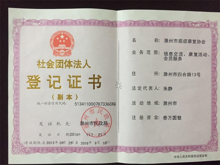滁州市癌症康复协会 发布日期:2018-6-5 作者:管理员 来源:本站 阅读: 4758 次 依据国家卫生部2003年制定并颁布的《中国癌症预防与控制规划纲要》、按照《社会团体登记管理条例》和安徽省《关于加强和创新社会组织建设与管理的意见》规定,在滁州市人民政府及市民政局关心和支持下,在原滁州抗癌协会抗癌俱乐部的基础上由部分癌症患者发起成立的群众性癌症康复组织---滁州市癌症康复协会,于2013年9月10日核准登记正式成立。 滁州市癌症康复协会是以癌症患者为主体的,热衷于癌症康复事业的医务工作者及社会各界爱心人士参与的,自救互助式群众团体,是经市民政局核准登记的非营利性社会组织,为一级独立法人单位。现有理事会成员9人,其中常务理事3人、监事会3人;名誉会长、正副会长、秘书长、办公室主任、党支部、工会、妇联、康复部、艺术团及各片区组负责人等领导机构成员28人,目前注册生存会员682。 协会宗旨:遵守宪法、法律、法规和国家政策,遵守社会道德风尚,坚持用科学道理宣传教育病友,使大家认识到癌症是可以防治的。以健康的精神为统领,自我心理治疗为先导,首选西医,结合中医,坚持抗癌健身法锻炼,讲究饮食疗法,重视生活调理的康复模式,提倡自强不息、自娱自乐、自救互助精神,克服消极、悲观、恐惧心理,主张综合治疗、群体抗癌,树立战胜癌症再做奉献的信心。