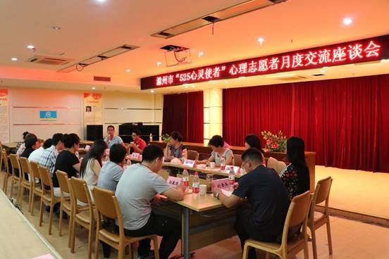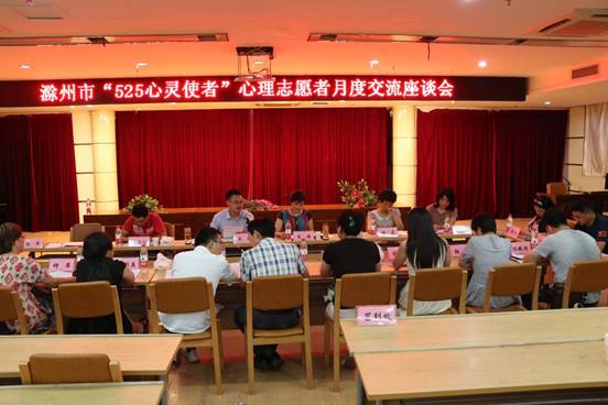 滁州市“525心灵使者”心理志愿者服务队召开月度交流座谈会 发布日期:2018-7-31 作者:社会组织联合会 来源:社会组织联合会 阅读: 1360 次 为进一步加强“525心灵使者”心理志愿者队伍建设,提升志愿服务队的服务水平。7月30日晚七点,市“525心灵使者”心理志愿者服务队在市青少年科技文化活动中心四楼会议室召开月度工作交流座谈会。 座谈会上,各位志愿者分别回顾了参加心理志愿服务的工作情况,对进校园开展心理服务的形式展开了积极讨论,同时也就工作中遇到的问题相互进行交流探讨。王标老师将近二月来心理中心开展的各项工作和近期工作安排向与会志愿者做了汇报,并对志愿者工作进行了业务培训。 最后肖雁老师代表未成年人心理健康教育中心对所有志愿者的辛勤付出表示衷心的感谢!希望在接下来的工作中,志愿者们努力做好各项工作,发扬志愿者服务精神,把志愿服务实践融入到文明城市创建中去,主动参与全国文明城市创建,积极投入“阳光成长进校园”、“525心灵使者”心理志愿进社区等志愿行动中去,播撒更多的文明种子,汇聚更强的社会正能量,为创建全国文明城市添砖加瓦。 此次交流座谈会,为今后心理志愿服务队的工作指明了方向,必将推进我市未成年人心理服务工作实现新突破、新发展。 作者:刘雪兵